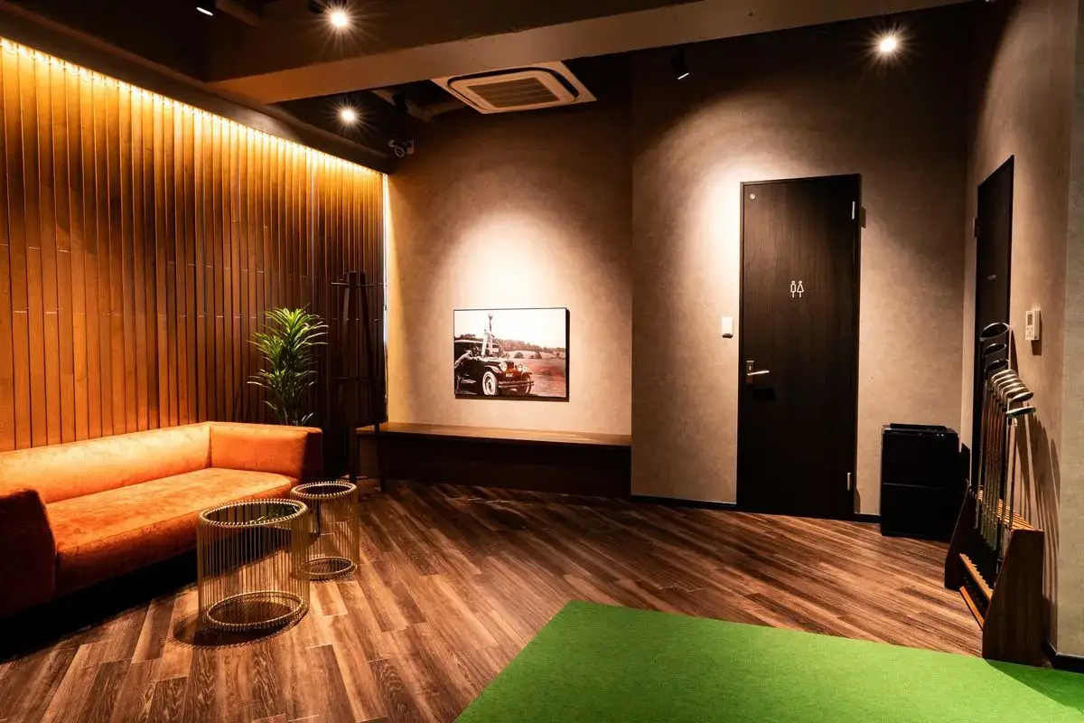 パッティングからミニラウンディングまで様々な練習が楽しめ、施設内にはくつろげるソファーやテレビ、プライベートロッカールームも用意されています。