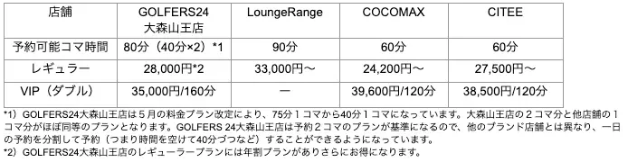 大森エリアにおけるインドアゴルフ店舗の通い放題(時間帯限定)プランの比較